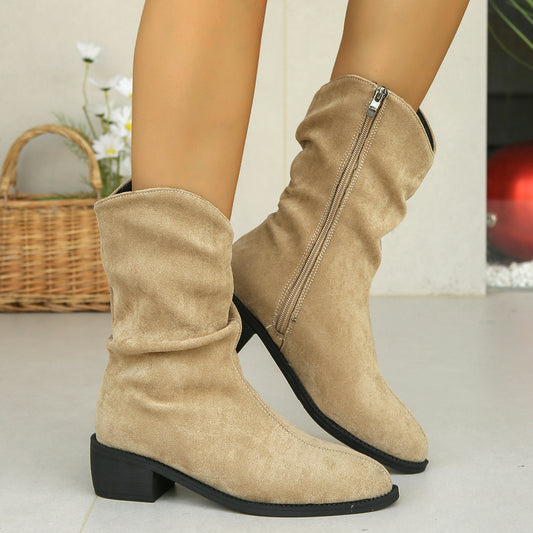 Bottes hautes en daim à talon moyen, fermeture éclair latérale